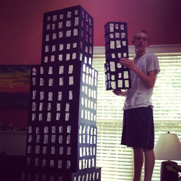 A few months ago, my friend Mavis and I began work on a big project for the party. Our mission: to build the Sears Tower. How hard can that be? We spent a long morning painting, cutting and hot gluing and marveled at our handiwork even though we didn’t complete the project in one fell swoop. Now, construction of that impressive edifice is nearly finished. I only have to find two paper towel rods, paint them silver, stick them to the top of the building and voila! our indoor skyscraper will be done. The orange hair, freckle face OS dutifully assisted efforts yesterday in putting another few stores on the building. I should have been an architect, I mean check this out, very life-like, don’t you think? Actually it looks pretty cool but it is funny to have people stopping by our house for incidental things and suddenly seeing a giant cardboard skyscraper in the house. They’re not sure what to think.
