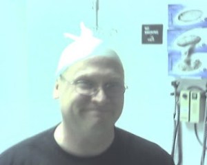 There were a few moments of levity at the hospital. Uncle Mark was quite the hit when he put a rubber glove over his head. JD took this picture on his cell phone.