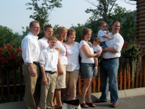 Oh my, was Aaron thrilled when I asked him to “hold” his brother for the cousins photo! NOT! Thank goodness he’s such a good-natured guy who loves his mama. Sorry the picture is so small. Aaron is the tall guy on the left. He’s “holding” Nate! How sweet is that!