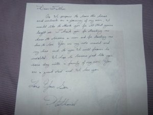 Whereas Aaron seems to be just fine, Mark and I were a mess on Father’s Day. Although the guys and I gave Mark some pretty sweet gifts: DunderMiflin Paper Company t-shirt, frisbee golf discs along with handy-dandy holder and a very clever book (click here), it is the written words of our sons that were the most heartfelt and memorable.