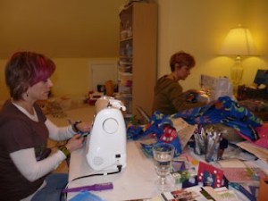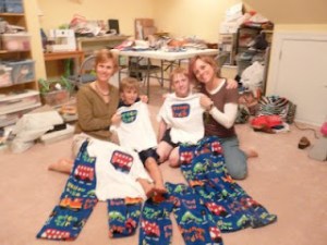The mood was lively and jovial as we cut the material and set to the task of cranking those pj pants out in record time. Our machines were purring like kittens and I was especially excited to be using a stitch on my machine I had never used. It’s funny the things people, (ok, not everybody, but some people, like me) can get excited about…maybe it’s like a guy using a new kind of nail or a fancy hammer, I don’t know.