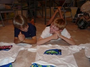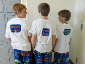 And check these out! First, check out Ike’s face as he got ready to walk into his class with Orange Train emboldened on his chest! Aren’t they adorable! Here are the guys workin‘ it with their matching pajama pants and appliqued t-shirts. They were a big hit at the middle school and I’m already thinking about next year’s design. Yes, I’m insane.