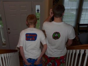 And check these out! First, check out Ike’s face as he got ready to walk into his class with Orange Train emboldened on his chest! Aren’t they adorable! Here are the guys workin‘ it with their matching pajama pants and appliqued t-shirts. They were a big hit at the middle school and I’m already thinking about next year’s design. Yes, I’m insane.