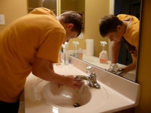 One day when Aaron is older, I think he will look back at this experience and smile. He will hopefully recall how we didn’t back down and trained him up in the way he should go. “You show love to your family when you flush the toilet,” I offered a proverb of my own. (Feel free to use it with any male in your house). Aaron reflected upon this, not sure what to say but I think he’s learned a few lessons, not just about washing sinks and scrubbing toilet bowls but about character and consideration. Maybe he’ll be a Christian plumber/actor/football pro one day! A righteous man who loves the Lord, puts the seat down AND flushes – I have high hopes! He should be excellent husband material one day!