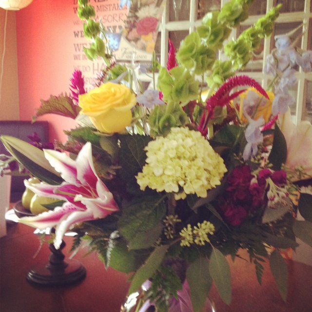Bells of Ireland, delphinium, rubrum lilies, roses, a breathtaking bouquet!