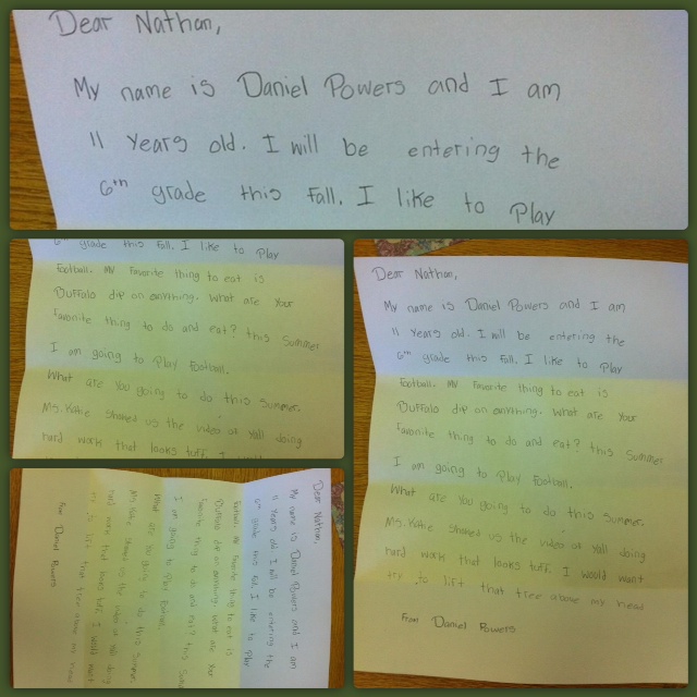 Cousins – This picture is from Nate’s seven-year old cousin, Jon. The more I look at this picture, the more I love it. Tanks, swamps, fish, words of encouragement, this drawing also has plenty of action and Nate is smiling through the whole thing. I’m not so sure about that in real life but I do know this. Nate will grin ear to ear because of this letter. According to Jon, Nate is the #1 23-year-old and I have to agree!